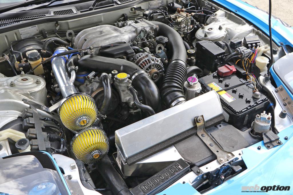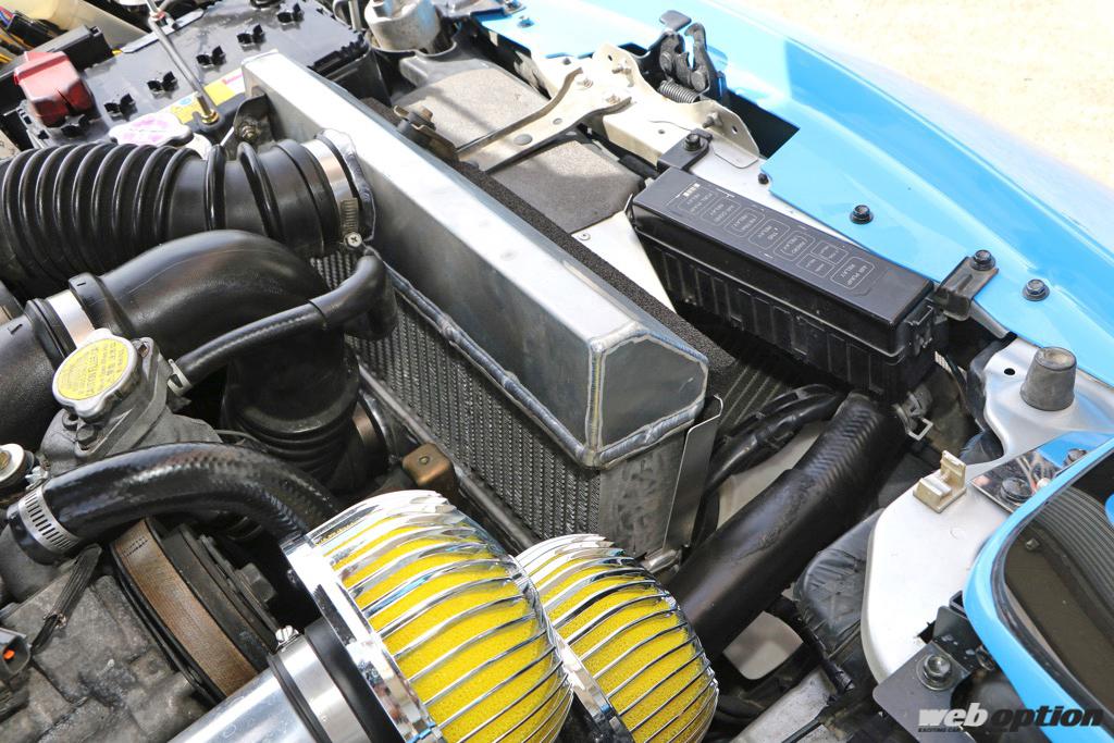 心臓部の13B-REWは、RE雨宮の手によってリフレッシュが施されたリビルトを搭載。耐久性重視で純正サイドポート形状のままとしている。エアクリーナーはトラストのサクションキット、インタークーラーは純正位置のままコアサイズを1.5倍にできる同社の製品を組み込んでいる。