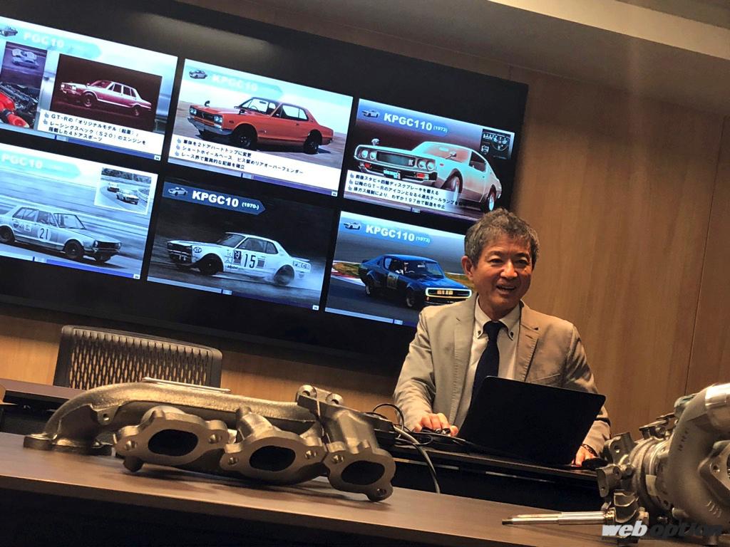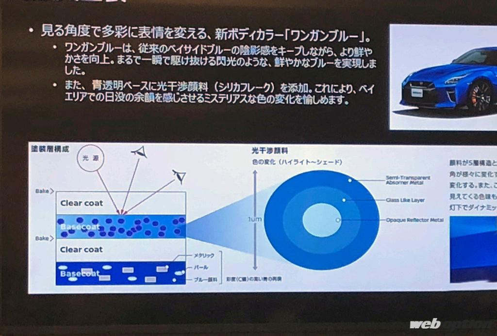話に熱がこもる。「水銀灯の下が大きなキーワードなんです。ですからね、GT-Rのワンガンブルーも水銀灯の光を浴びた時に美しくボディラインを映し出す深みを持たせました。どうやったかというと、青発色する1ミクロンのビーズ(光干渉顔料:シリカフレーク)を開発して塗装コートに添加しています。かつ、ベースコートにもブルー入れてメタリックも入れて…4コート2ベークですよ! ぶつけたら大変なので注意ですよ(笑)」。