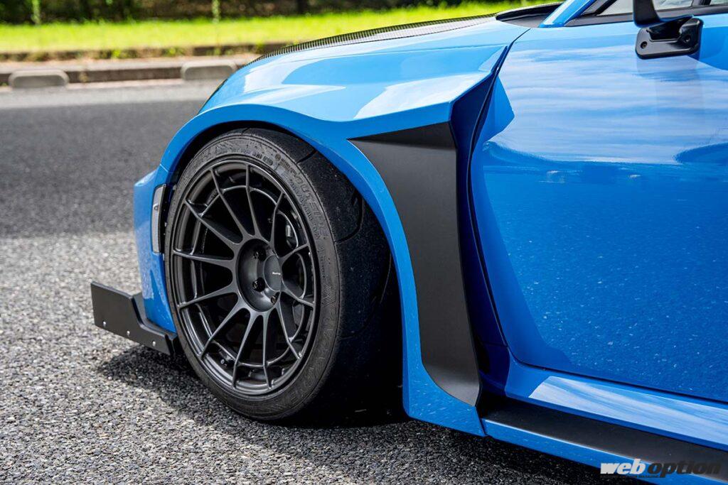 フロントのワイド幅は片側70mm。295/30R18サイズのタイヤを履いてストリートからサーキットまでテストも行われたが、アッパーマウントでのキャンバー調整のみで問題なく全切り&スポーツ走行に対応する。純正ウインカーを流用できる構造とすることで、導入コストを抑えている点も見逃せない。
