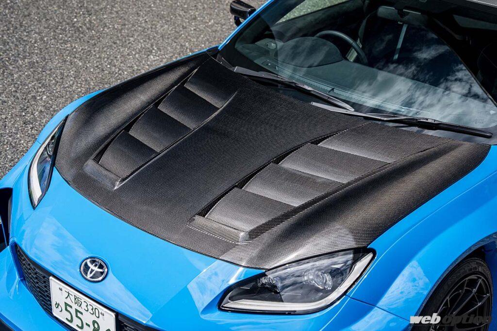 オリジナルのボンネットとGTミラーはボディキットに含まれないオプションパーツ。ボンネットはインフュージョンカーボン製で、冷却用のダクトや裏骨を設けた高機能アイテムながら、純正比マイナス25%の軽量化を実現。