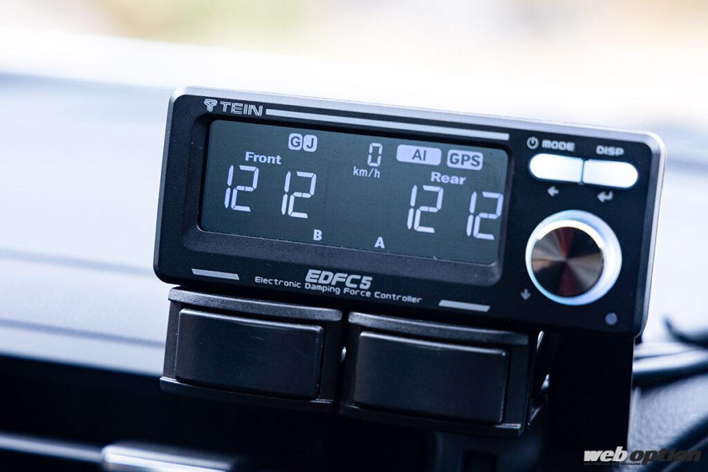 車内に設置するコントローラー本体。従来モデルはHTNパネルだったが、EDFC5ではVAパネルを新採用。クリア度が増し、液晶の視認性も大幅に上がった。数字はフロント左右、リヤ左右の合計4つの減衰力で、マニュアルモードではダイヤル操作で減衰力の調整が可能だ。上の『G』『J』などは設定されているモードを表している。