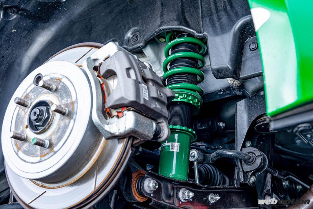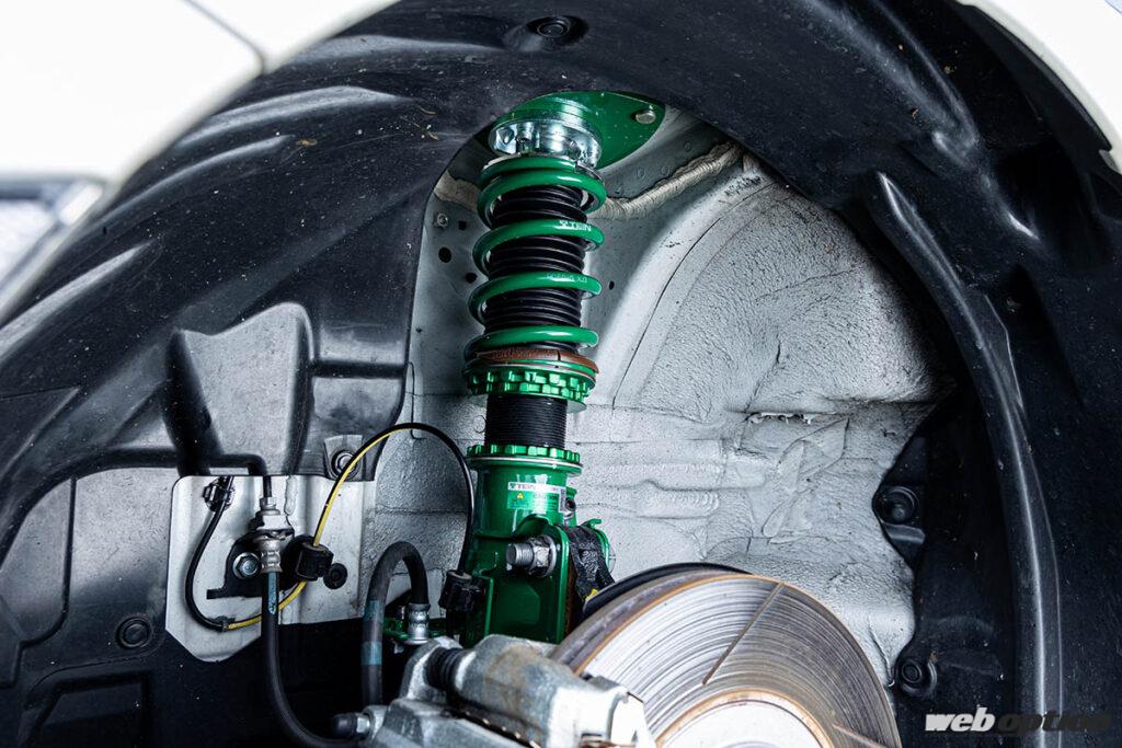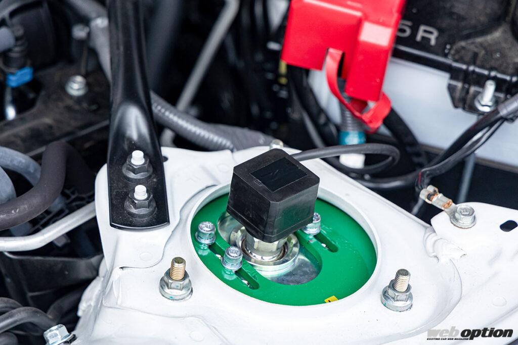 スプリングレートは、フロントが純正の3.0kg/mmから5.0kg/mmへ、リヤは3.5kg/mmから4.7kg/mmへとそれぞれアップ。スポーツ性能を生かしつつ、市街地での乗り心地を改善し、かつワインディングではロールを抑えるなど、挙動を掴みやすい味付けとなっている。
