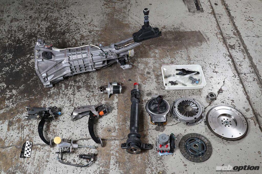 BRZのAT改MTに必要なパーツ群がこちら。肝心の6速MT本体に加えて、クラッチやペダル類、プロペラシャフト、MT用ABSユニット、スターターセルモーターなどが必要となる。