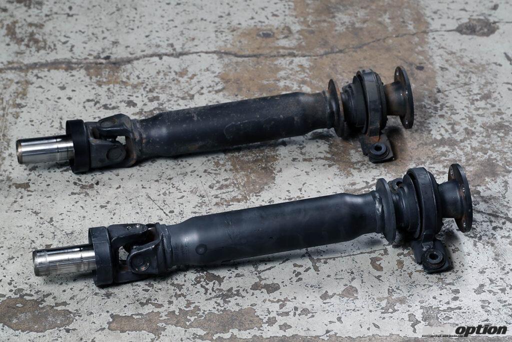 手前がBRZのMT用で、奥がAT用のプロペラシャフト(1軸)。スプライン径や長さが微妙に異なるため、MT用に交換しなければならない。