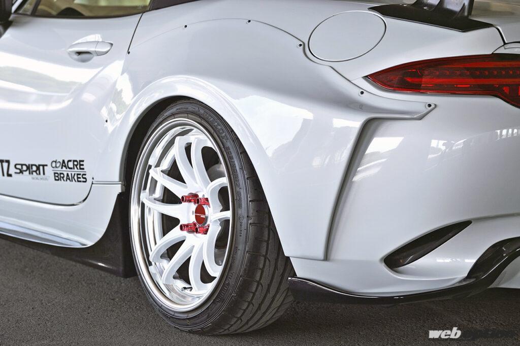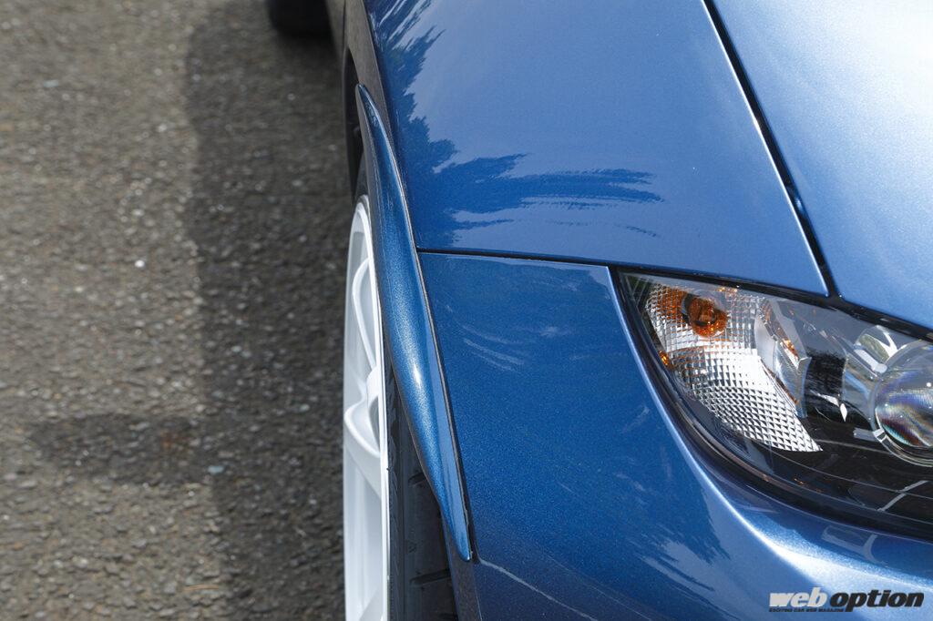 エンドユーザーの間で装着率が高まっているフロントのエアロフェンダー(11万円)は、純正比3mmワイドの設定。しかし視覚的にはそれ以上の広がりを見せているため、法規内でも十分な迫力を表現することができる。