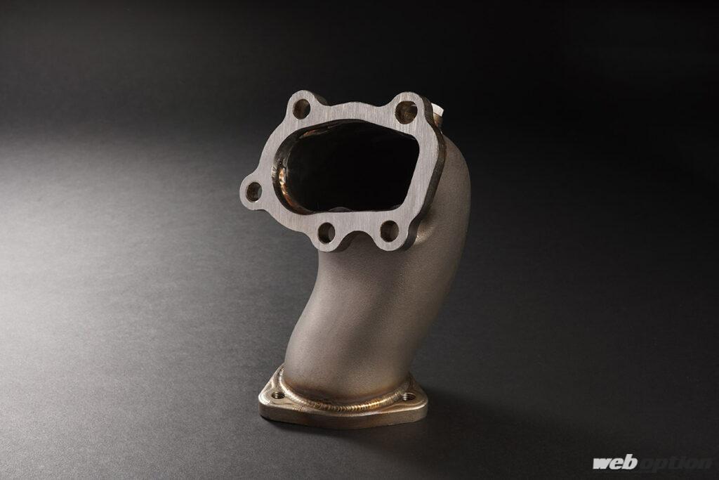 タービンからの排気をスムーズに流せるよう、十分な余裕をもたせた設計とすることで排気効率をアップ。さらに、パイプ部は溶接工程を廃したロストワックス製法による完全一体構造とし、高い強度と製品精度を実現しているのもポイントだ。