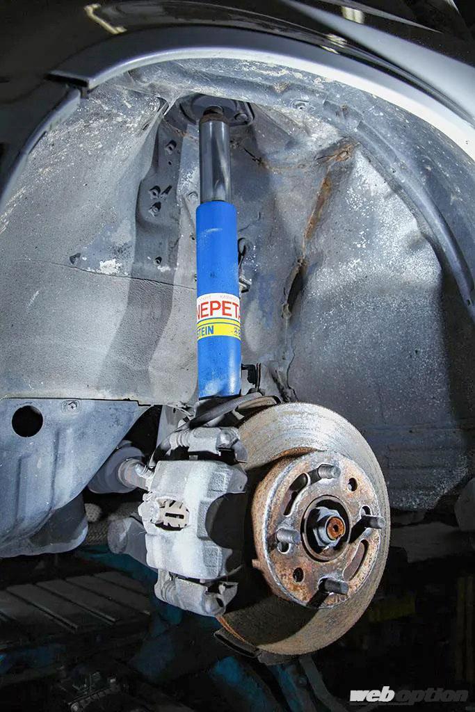 車高調はエナペタル製を導入。サスペンション型式は、フロントがトーションバー・ストラット式で、リヤがトレーリングリンク式ビームとなるが、これはスペース効率と回頭性&応答性を考慮した設計で、『スポルテックサスペンション』と命名されたものだ。