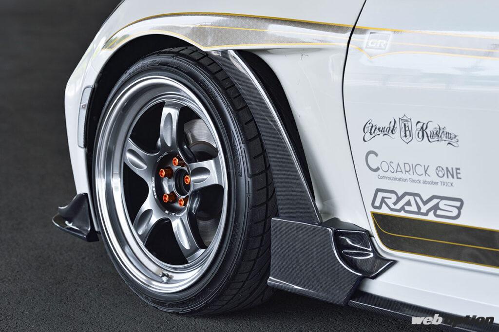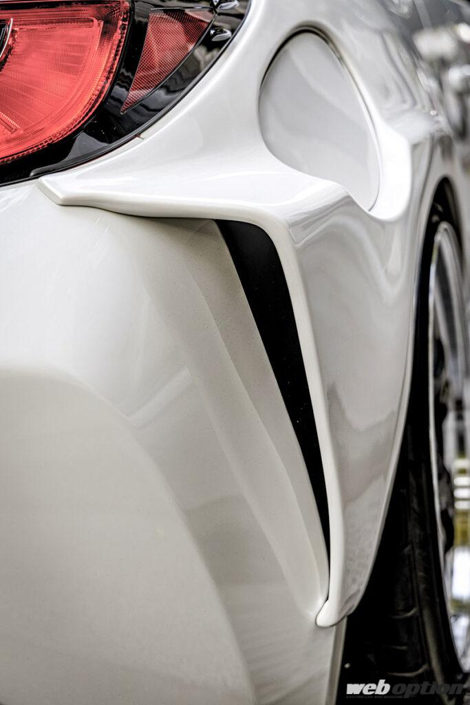 とくにエンド部分はフロントフェンダーのダクトとシンメトリーになったかのような、大胆なダクトデザインを採用。並みならぬ存在感を放っているが、実際の出幅はノーマルに比べて片側10mm以内に収められているため、構造変更の必要がない車検対応品なのだ。