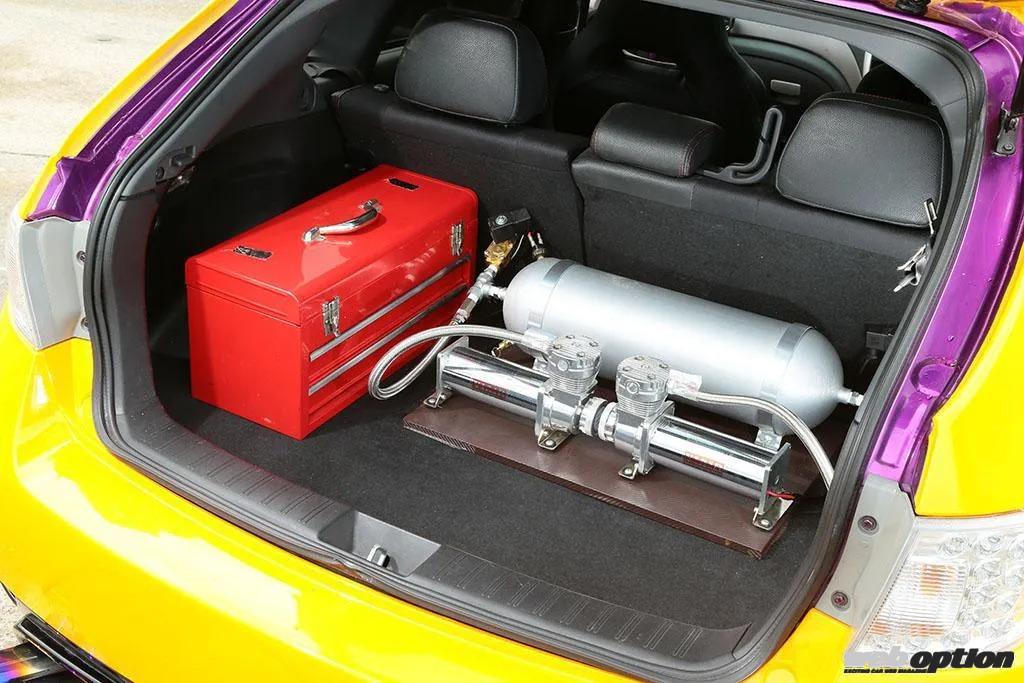 ラゲッジルームにはエアサスのコンプレッサー&タンクを搭載。ちなみに、エアサスおよび調整式アーム類は公認を取得した合法仕様だ。以前のキャンディーパープルをあえて差し色として残しているのも拘りで、NBAレイカーズのチームカラーのような強烈なコントラストを生み出す。