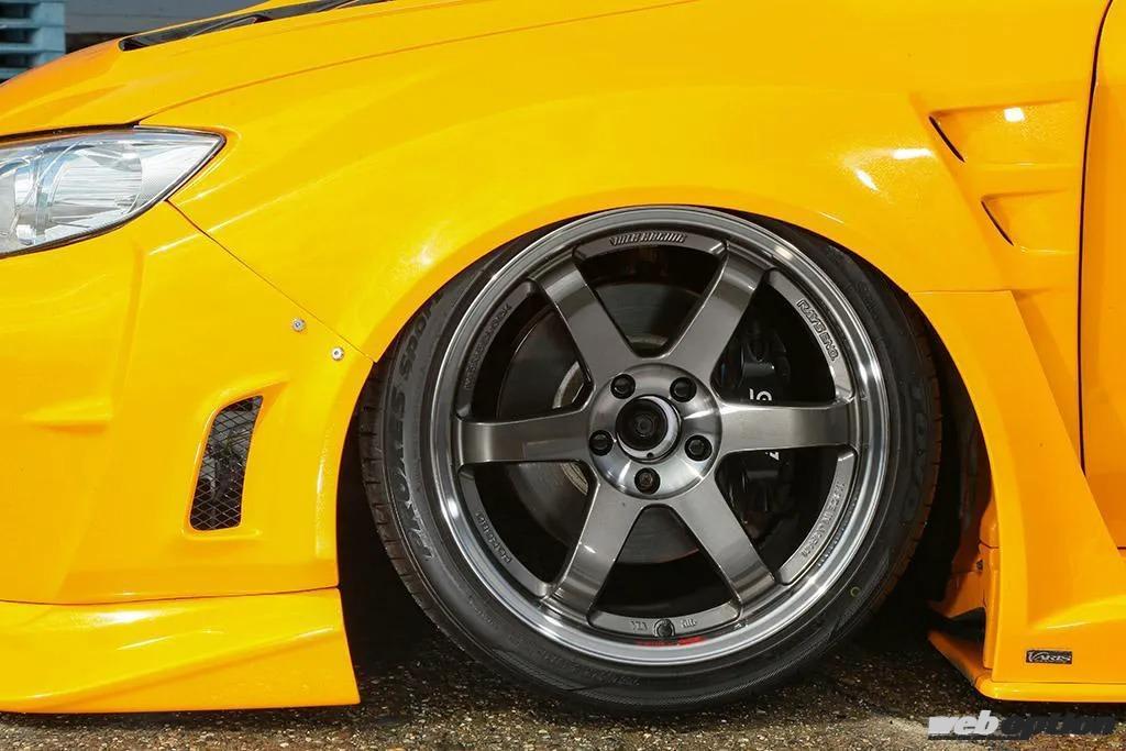 足回りはエアサスで極限までローフォルム化した上で、鍛造1ピースのボルクレーシングTE37SL(FR11J+38×18)をインストール。ハッチバックスポーツの軽快なイメージを打ち出している。