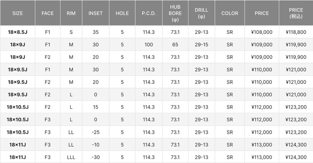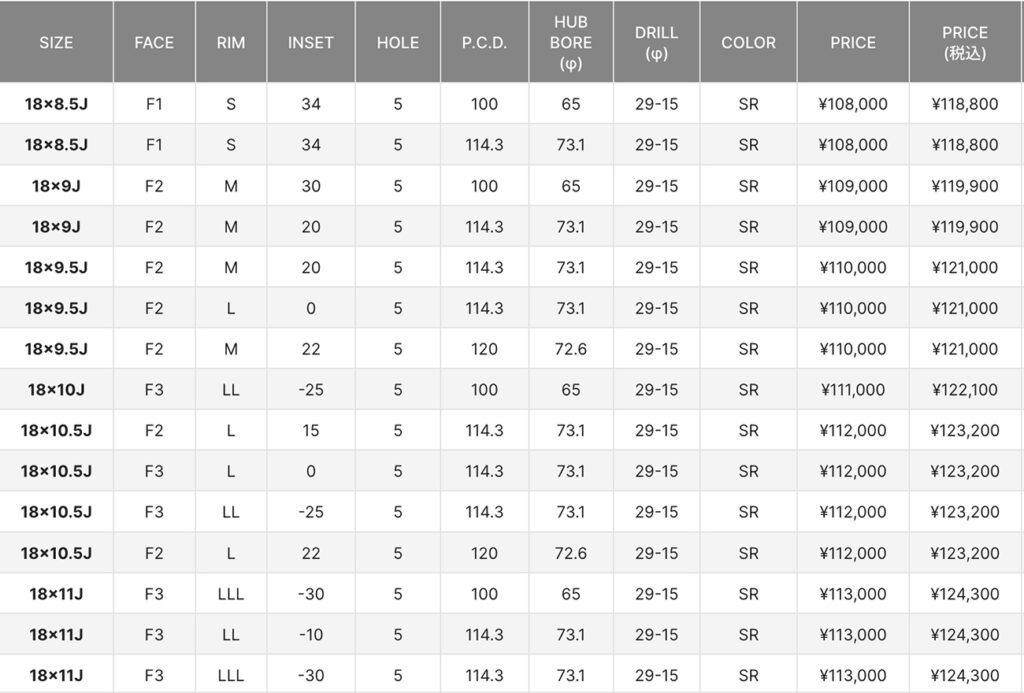 サイズはどちらも18インチのみの設定で、リム幅は8.5Jから11Jまでの展開。型鍛造で10J以上にマイナスオフセットを実現しているのは驚異的だ。