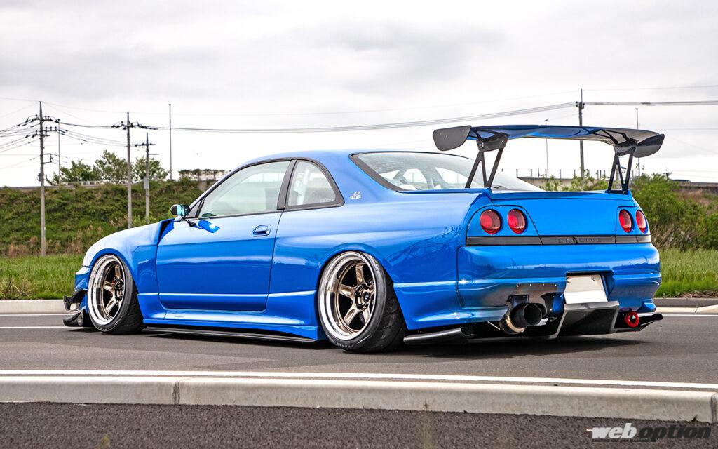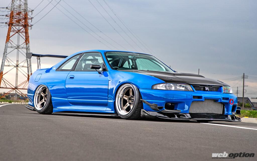撮影車両は、BCNR33の中でも希少なLMリミテッド・Vスペック。リアルファクトリーMのフロントワイドフェンダーをインストールした上、前後に18×11J-10(スペーサー10mm)という強烈なサイズの21C spec-SRをマッチングさせているが、そのプロポーションは美しいの一言だ。ちなみに、タイヤにはプロクセスR888R(255/35-18)を組み合わせている。
