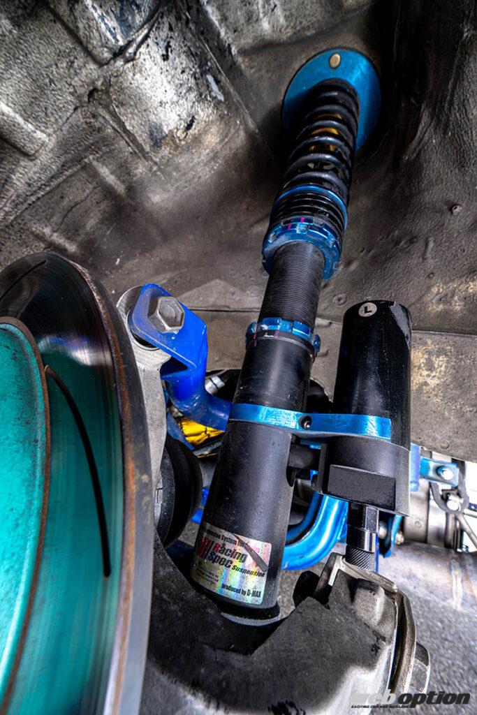 車高調は別タンク式のD-MAXレーシングスペック。セッティングを突き詰めていくと伸び、縮みを個別に設定できるメリットは大きく、商品化の際もこだわりがあったようだ。一方、スプリングは反発力にこだわりなく、D-MAXの標準レートから2JZに合わせフロントのみ硬くした12kg/mm&6kg/mm。
