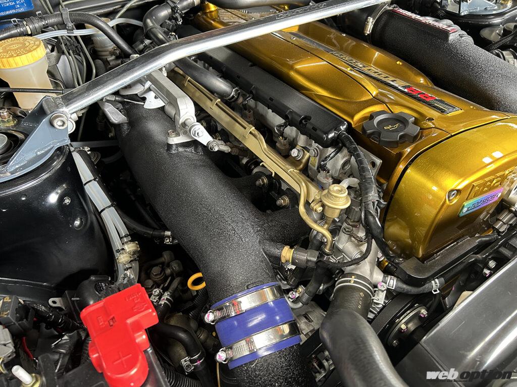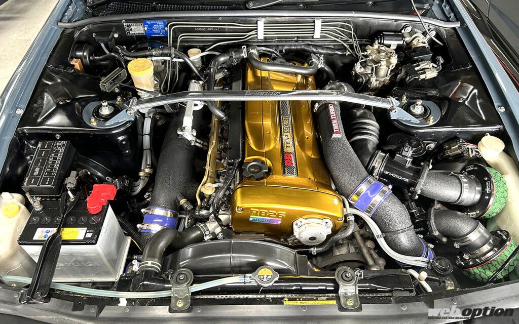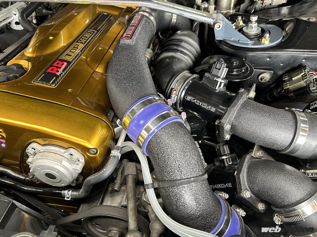 クリーンなエンジンルームに収まるRB26DETTは、フルオーバーホールと同時にHKSの鍛造ピストンや強化メタルなどを組み込んだ2.6Lの強化仕様だ。R35GT-Rのエアフロを流用して近代化を図りつつ、そこにHKSのGT-SSタービンをセット。ハイレスポンスな500psを作り上げている。