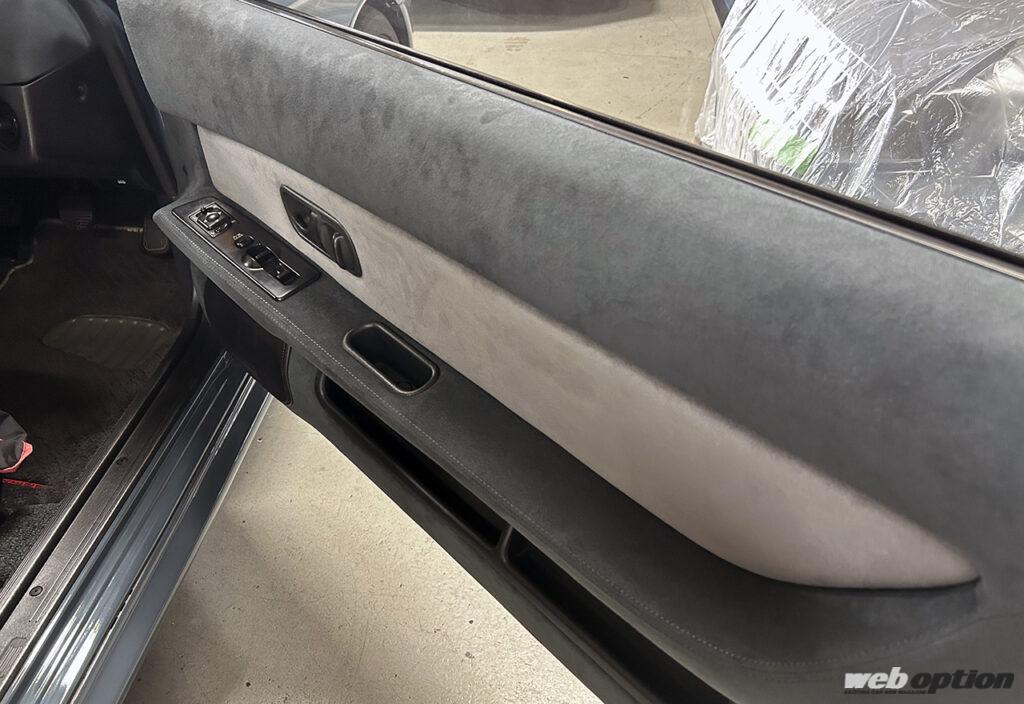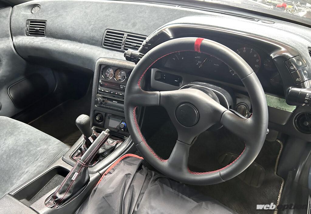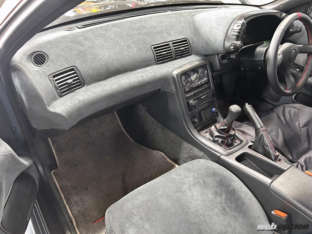 内装も程度の良いパーツを使いつつ、ウルトラスウェード生地を贅沢に使ってパネル&シートのフル張り替えを実施。ステアリングやシフトブーツなどはトップシークレットのオリジナルモデルだ。