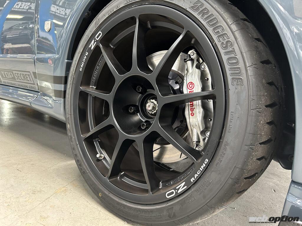 足回りはHKSのハイパーマックスRを軸にセットアップ。ホイール&タイヤは、OZレーシングのチャレンジHLTにポテンザRE-71Rという組み合わせ。もちろんどちらも新品だ。