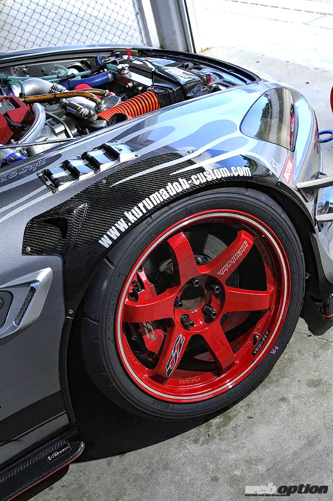 サスペンションはテインスーパーレーシングベースのオリジナルスペック(FR:20kg/mm)、ブレーキはフロント6ポット&リヤ4ポットのD2キャリパーシステムで強化。ホイール&タイヤは、クルマドーオリジナルのワイドフェンダーをセットした上で、前後18インチ×10Jプラス39のボルクレーシングTE37RTと295/30-18のアドバンA052をセットしている。リヤデフはOS技研のスーパーロックLSDだ。