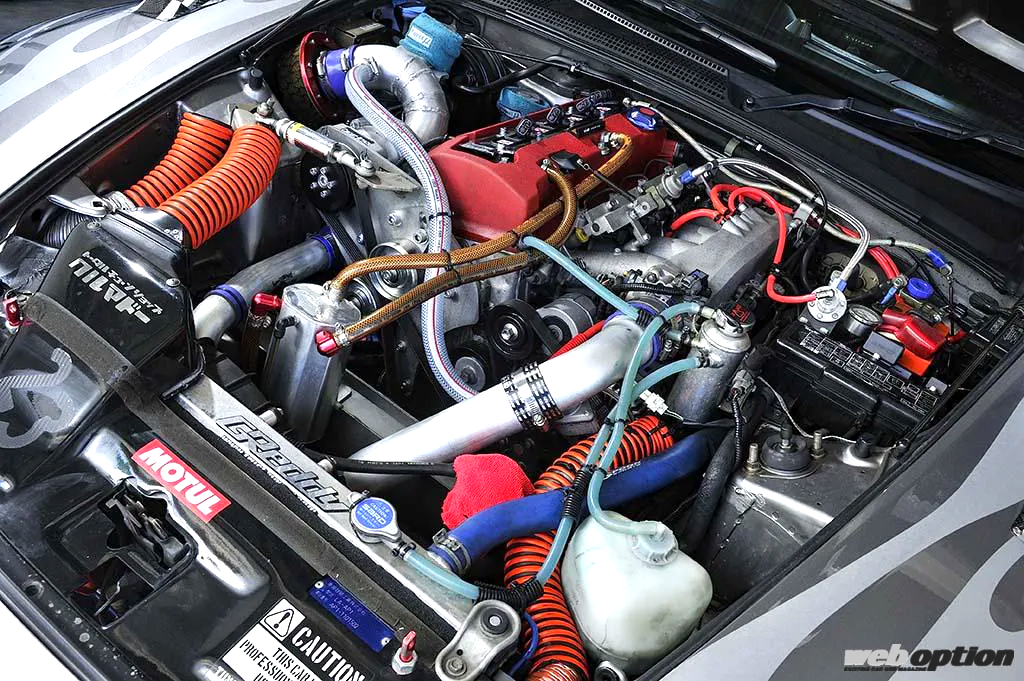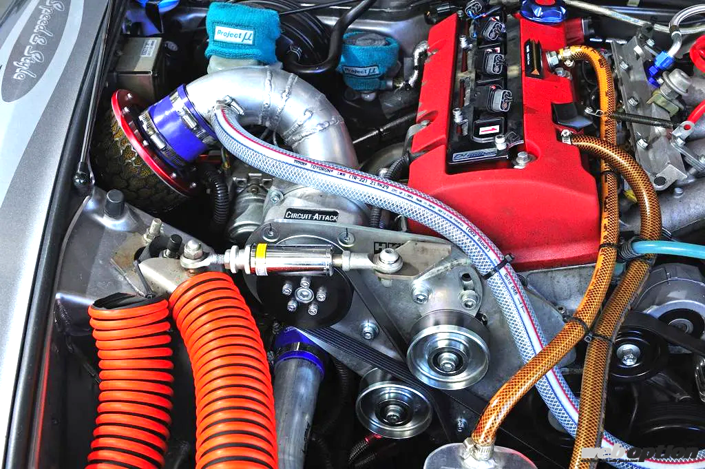 そこにHKSのGTS7040スーパーチャージャーをインストール。インテークパイプを大径化して吸気環境を整えながら、プーリー比を変更してブースト圧を1.0キロまでアップ。これにより、実測で407psを発揮するハイスペックを作り上げた。