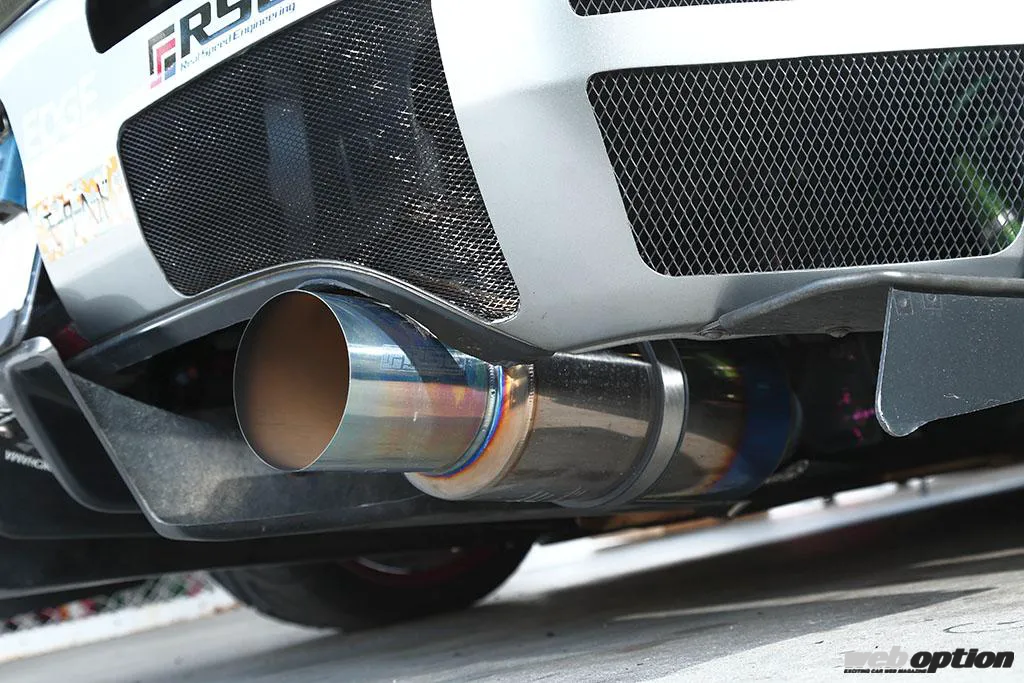 エキゾースト環境は、戸田レーシングのEXマニ→サードスポーツキャタライザー→リアルスピードエンジニアリングのフルチタンマフラーというレイアウト。マフラーはメインパイプ70φ→テール115φのシングル出し構造で、純正から19kg以上の軽量化が可能なレーシングスペック。チタン特有の乾いた高周波サウンドも特徴的だ。