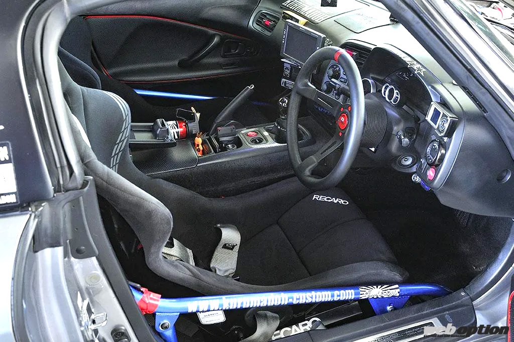 オープンカーのS2000ということで、乗員保護を目的にサイドバー付きのロールバーを導入したインテリア。ステアリングはMOMOフルスピード、シートはホールド性が高いレカロのTS-Gに交換されている。