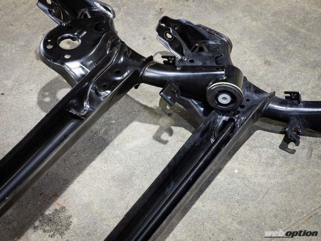ベースとして使用するアクスルは新品のNA用。ターボ用はアクスル裏に補強バーが加えられるが、このバーの存在によって硬さが優り、スタビが効き過ぎているような動きになってしまう。アクスル自体のねじれを利用して、左右の接地圧を高める方が速さに繋がるのだ。