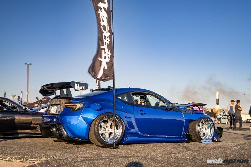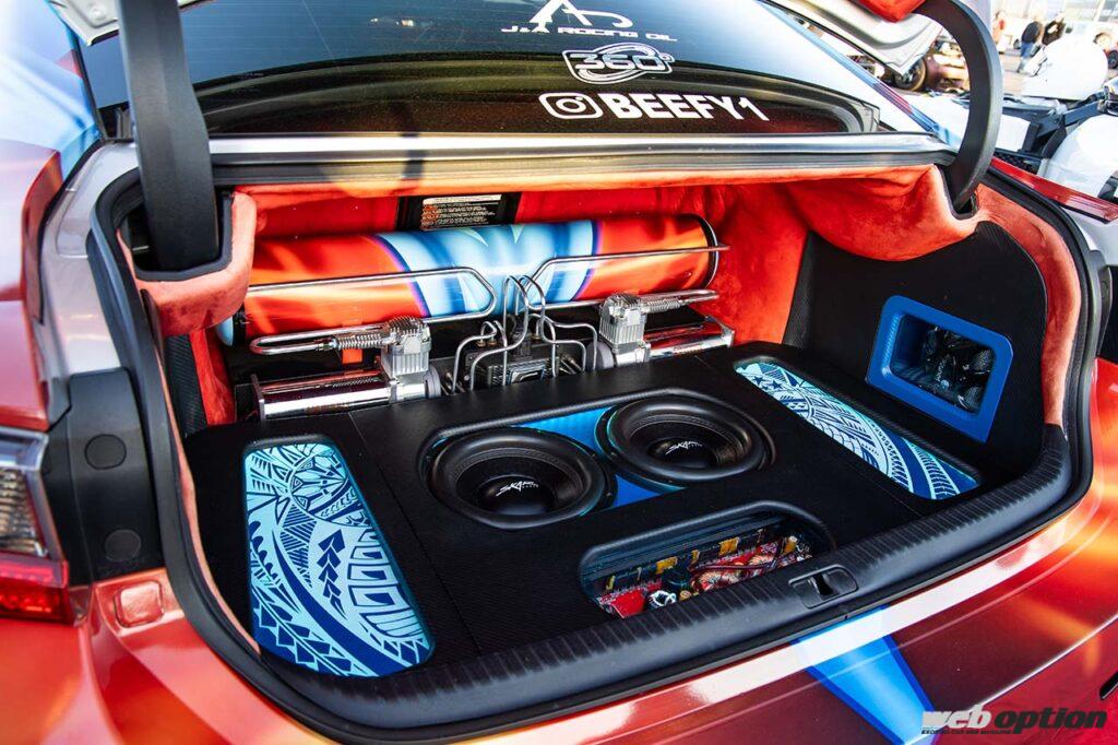 アメリカではこれまで東海岸で人気が高かったスバル車だが、最近は西海岸のカーショーでも見かける機会が増えてきた。こちらの2018年モデルはMntRider Designのワイドボディを備え、エアリフトのエアサスでローダウン。シャシーマウントルックのウイングも備え、完全なるスタンスへと変身を遂げている。