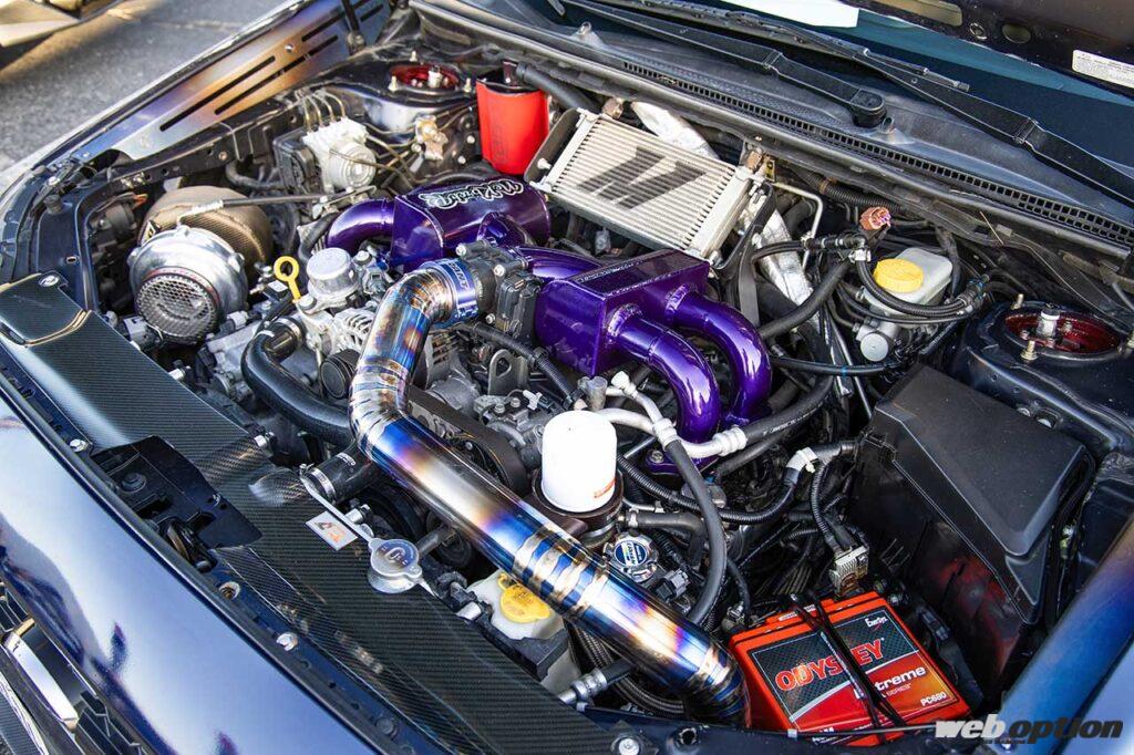 エンジンはETSのターボキットを使いつつ、タービンを目立つ位置にトップマウント。インタークーラーを前置きしてチタンのインテークパイプを使う他、恐らくワンオフだと思われるインテークマニホールドは2気筒ごとにサージタンクを設けた構造を採用している。