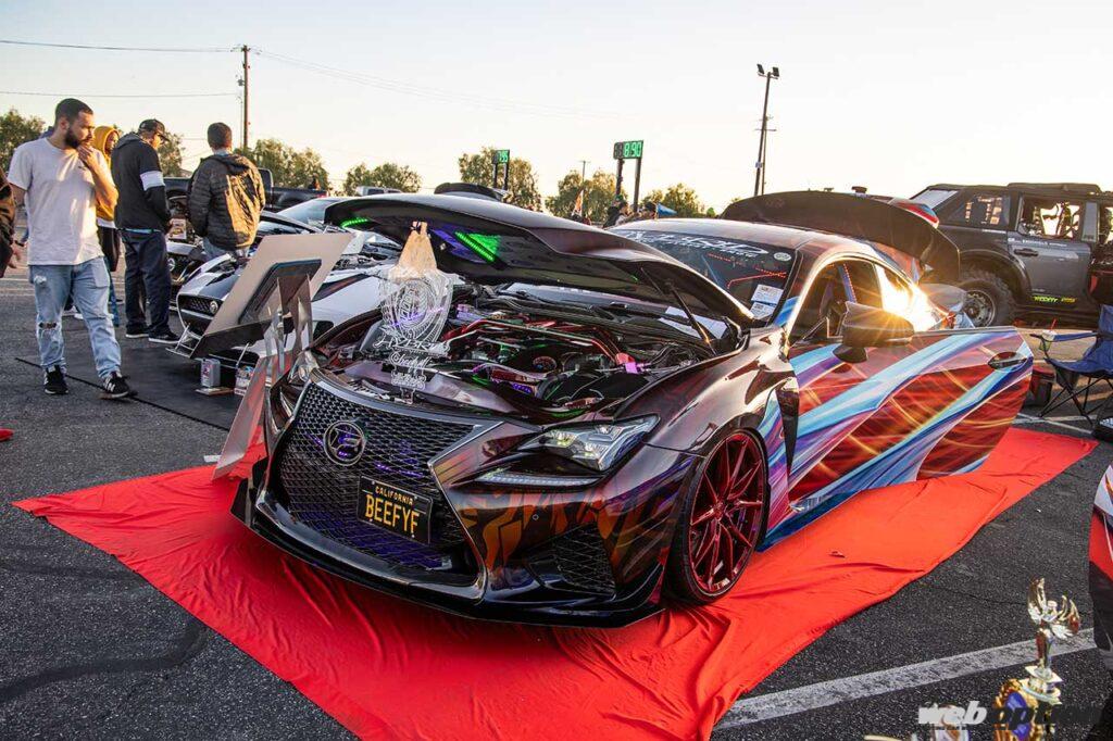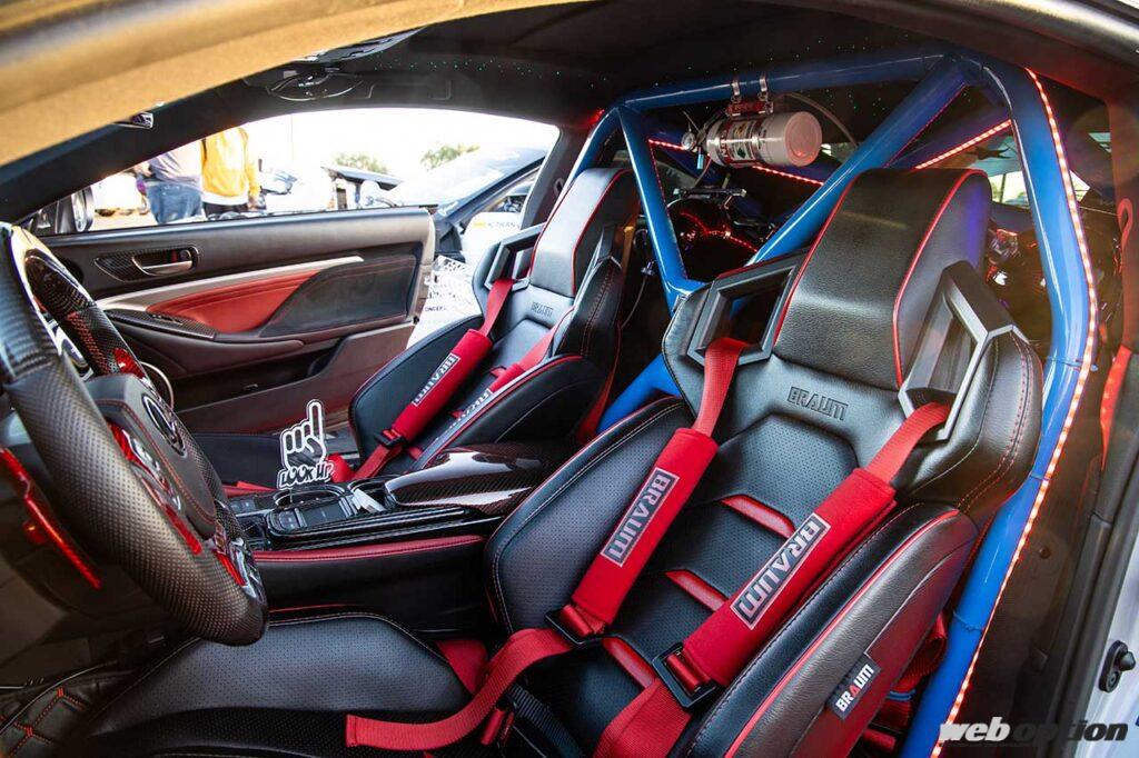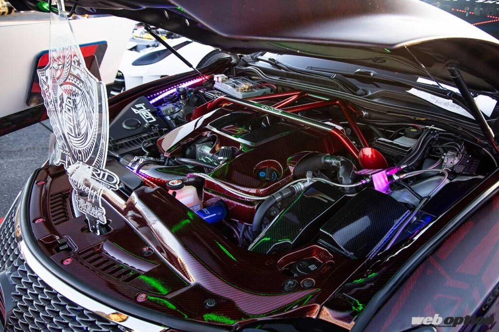 カラーリングからしてローライダー志向のメキシコ系かと思いきや、フィリピン系のオーナーが隅々まで手を入れ、ショーカーとして仕上げたレクサスRC F。5.0LのV8エンジンはNOSでドーピングが図られ、740psの最高出力を誇るという。