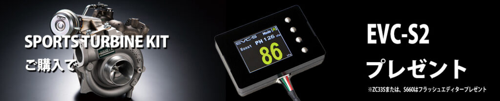1JZ、SR20、RB26、S07A、4G63、4B11、EJ20、R06A、K14C用スポーツタービンキットを購入すると、EVC-S2(5万4780円)がプレゼントされる。