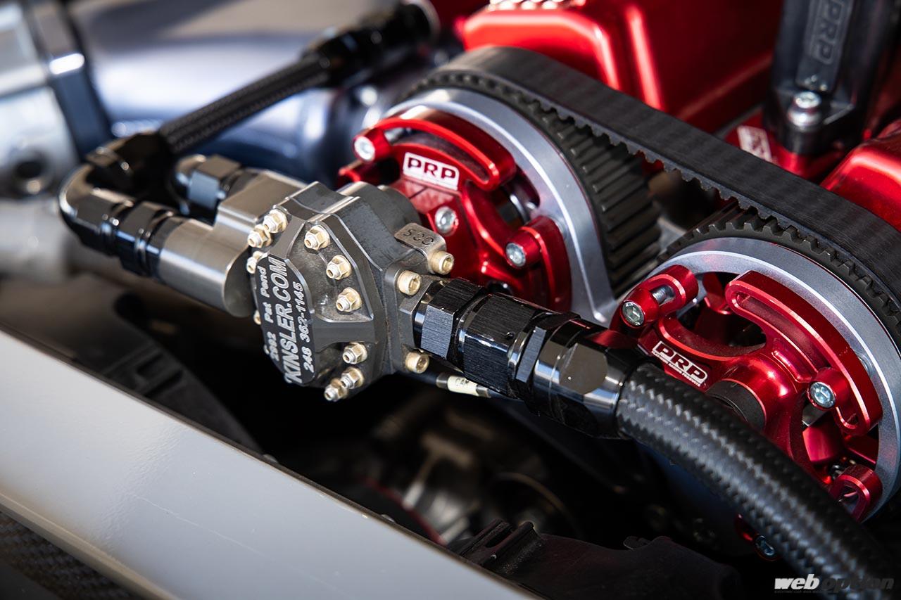 ビレットブロックを使用するRB26をシングルターボでセットアップし、ドライサンプも採用。ロス・パフォーマンスのビレットカムカバーやミシモトのラジエターなど、一部のパーツをレッドで統一してエンジンルームのアイキャッチにしている。レーシーな機械式燃料ポンプと電子制御スロットルを併用するのが、会場に集まったハイパフォーマンス系によく見られたチューニングだ。トランスミッションはPPGのシーケンシャルを組んでいる。