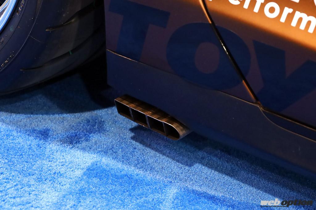 サイドにレイアウトされたエキゾーストマフラーもインパクト抜群。オールドスクールなチューニングカーを意識したメイキングがこのテスラのキャラクターを物語る。