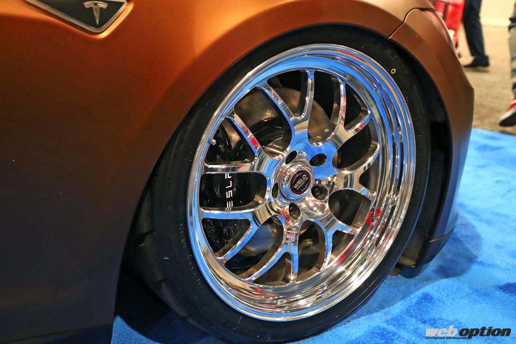 ギラギラと輝くホイールは、WELDの鍛造3ピースモデル“S77HD”。ブレーキはテスラ純正をそのまま使っている。