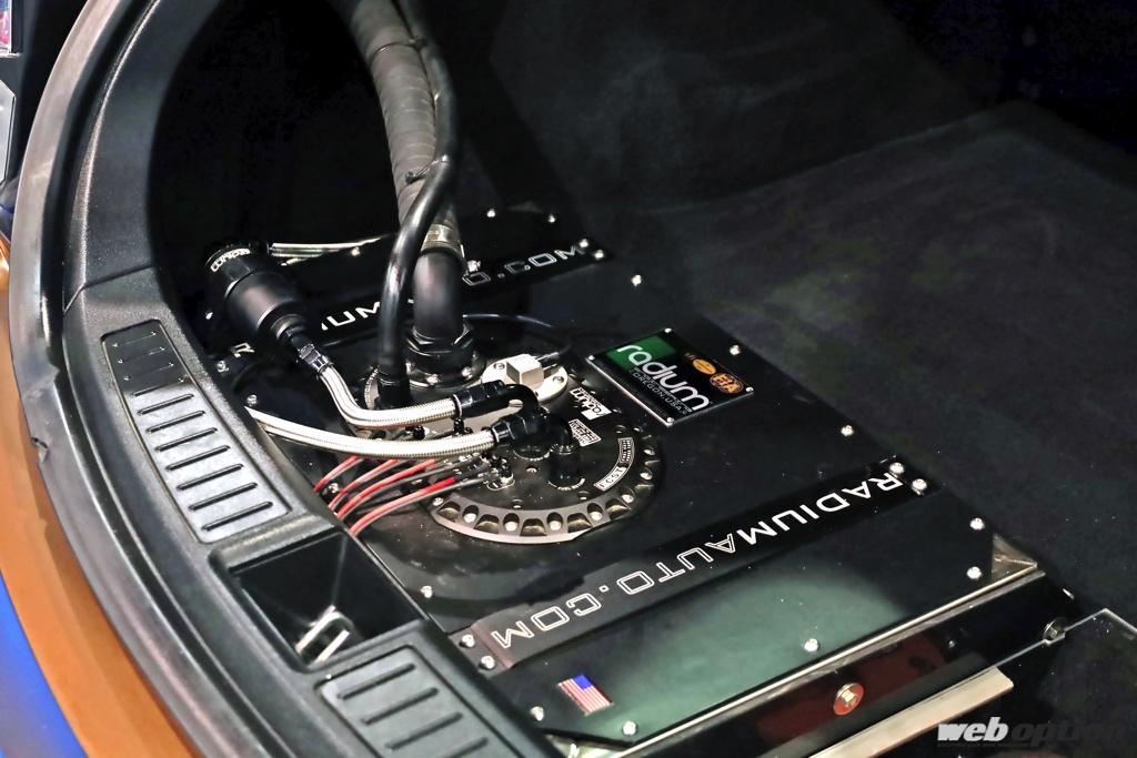 ベースがEV車両のため、燃料タンクも新設。リヤトランク内にラディウム製レース用ガソリンタンクとバッテリーを美しくマウントしている。