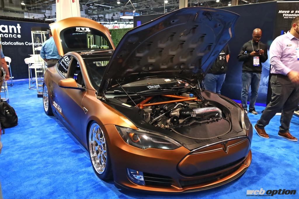ブラウンカラーのこのテスラモデルS、なんと最先端のEVシステムを捨て去り、ガソリン垂れ流しのアメリカンV8エンジンへとコンバートしてしまったのである。パイピングやアダプター類を専門とするカナダのパーツサプライヤー“Vibrant Performance(バイブラント・パフォーマンス)”からの出展だ。