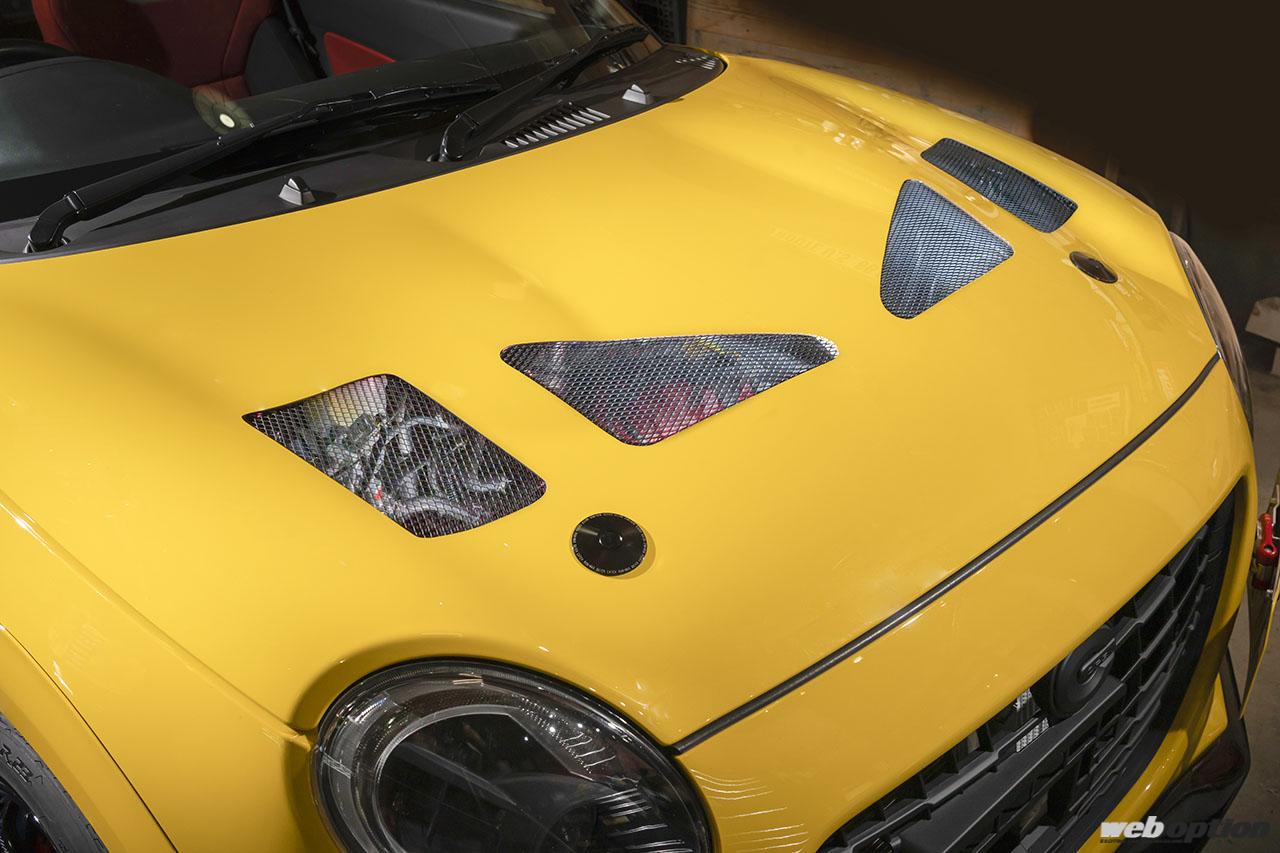 “縦置きエンジン”をチラ魅せしつつ、雰囲気を演出するための策が、TRDのJZA80用3000GTボンネットをオマージュしたダクト付きボンネット。幅や位置など綿密に計算して導入したという。