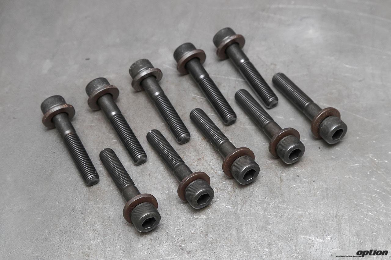 クランクシャフトをシリンダーブロックに固定しているクランクキャップのボルトは、燃焼圧力により高い負荷を受け止めている部分。F6A(ツインカム/シングルカム)はスタンダード、タフ仕様とも強化タイプを標準で採用している。