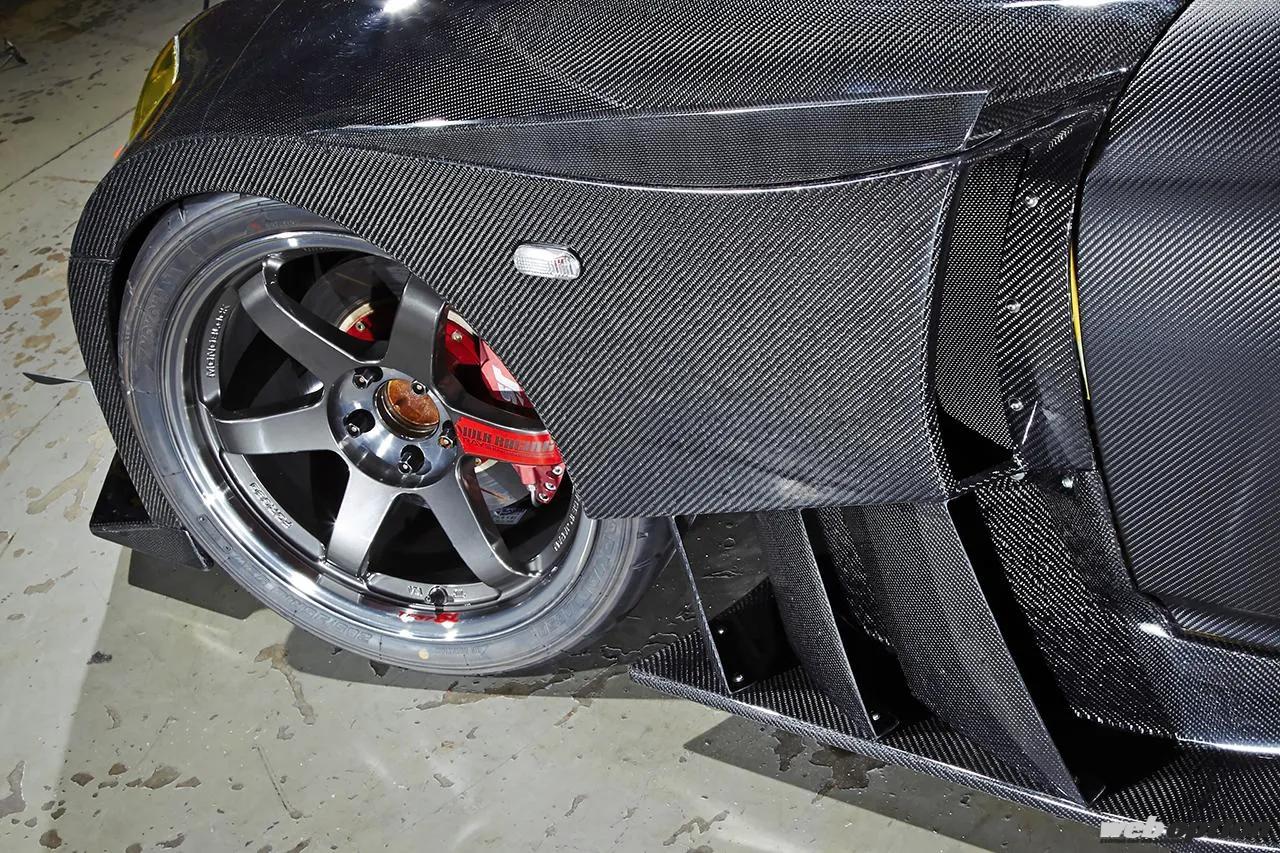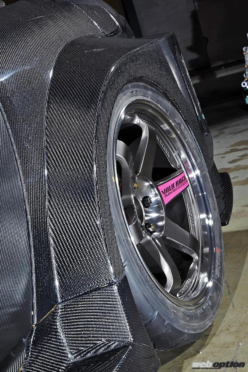 片側75mmもの張り出しが与えられたリヤフェンダー。その恩恵を最大限に享受し、10.5J+18のワイドリム&ローインセットのボルクレーシングTE37SLと、295/35-18のワイドタイヤを装備する。