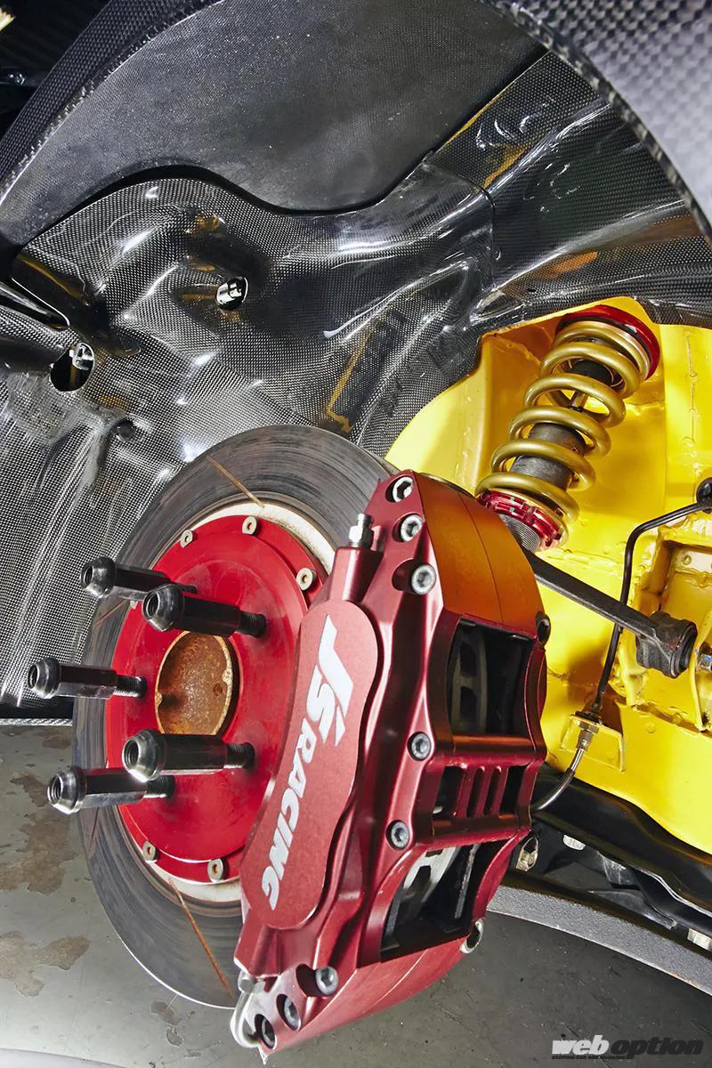 一方のサスペンションはジェイズレーシングのSPL品(FR28kg/mm)で、路面状況への対応力を高めるためにレース用の調整式スタビを前後に組み入れている。車速向上に対応するためのブレーキは軽量な鍛造アルミ製の6ポッド。