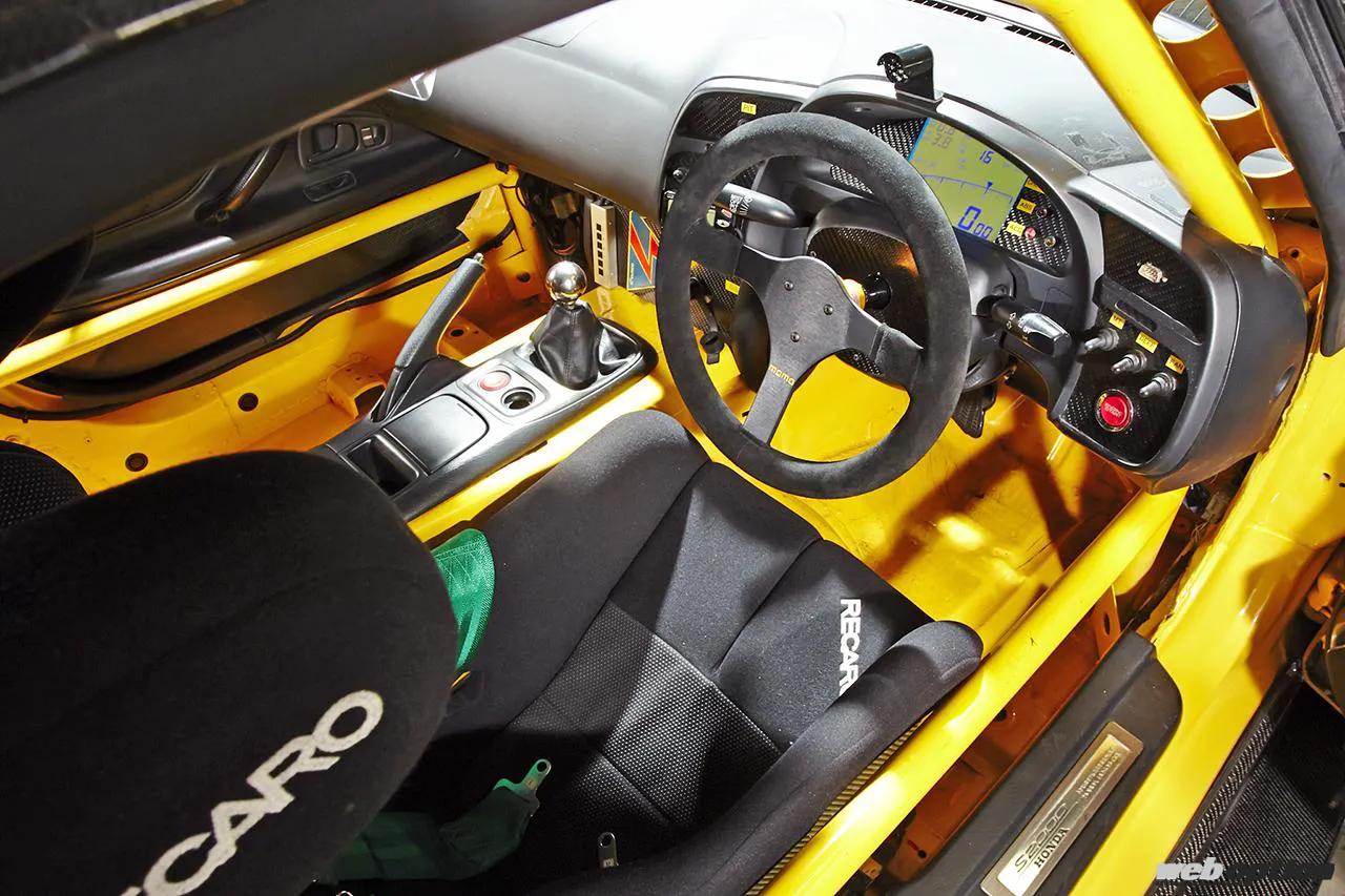 不要なものが徹底的に排除され、シンプルかつレーシングに仕上げられた室内。フルスポット増しなどの補強も加えられるが、9点式ロールケージの構成パーツは最小限に抑え、軽さと剛性を高次元でバランスしている。メーターはMAXレーシング製、ステアリングはMOMO、シートはレカロのSP-Aだ。