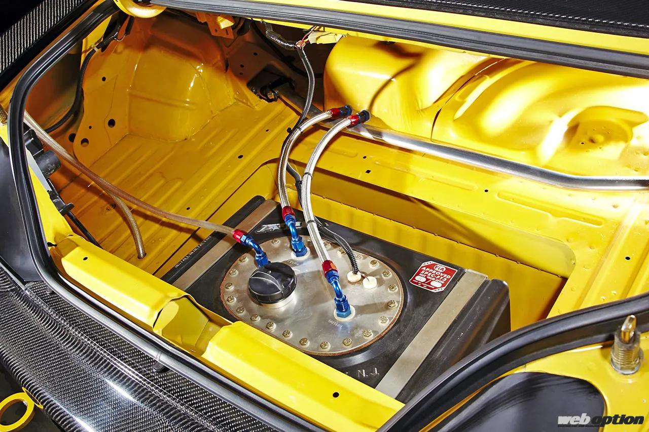 巨大な純正の燃料タンクを撤去し、ATLの30Lタンクを搭載して軽量化。燃料の偏りが発生しやすい純正に対し、インタンクコレクター式のためコーナーでの息継ぎなども回避しやすい。