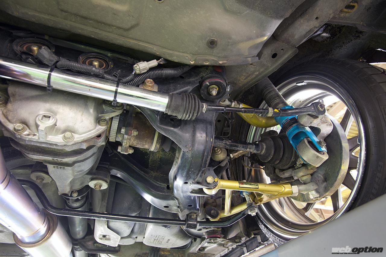 エンジンやエクステリアなど各所はGT-R化されているが、駆動はもちろんFR。ミッションはRB25用の5速をそのまま使い、オイルパンガードを装備してドリフト走行時のコースアウトなどにも備えている。車高調はGPスポーツの車Gマスターで、アーム類はイケヤフォーミュラの調整式をフル投入済みだ。