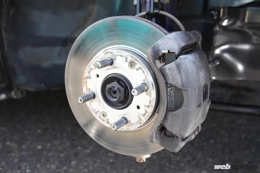 増大したパワーに合わせて、ブレーキはGD1フィットの純正システムを流用して強化が施されている。