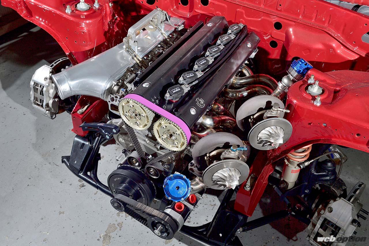 純正の鋳鉄製ブロックと比べて大幅な軽量化を実現しつつ、鍛造のアルミビレットを削り出して製作するため強度も純正以上。このブロックにHKSの2.8LキャパシティアップグレードキットやIN/EX:300度のハイカム、CPキャリロ製コンロッドを組み合わせて究極的な2.8L仕様を作り上げた。
