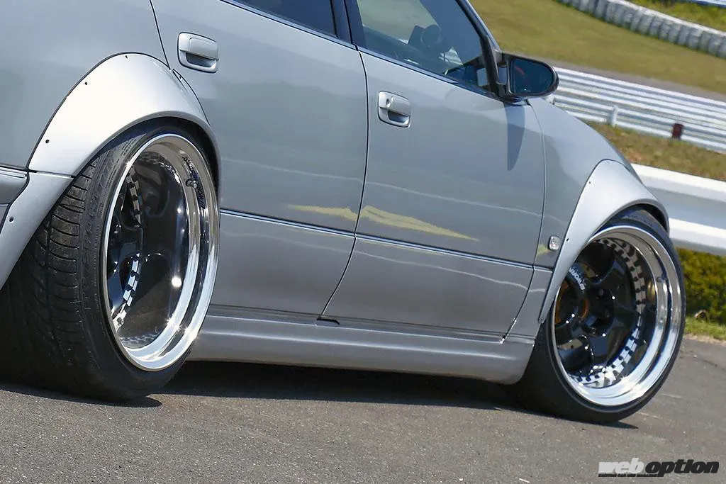 圧倒的なロースタイルを実現している車高調は、ラルグスのフルタップ式。オーバーフェンダーはワンオフ製作されたもので、フロント片側70mm、リヤ片側100mmワイド仕様だ。ホイールの出面に合わせてフェンダーを製作しているというだけあって、ツライチ具合は完璧だ。エアロパーツはKブレイクで統一している。