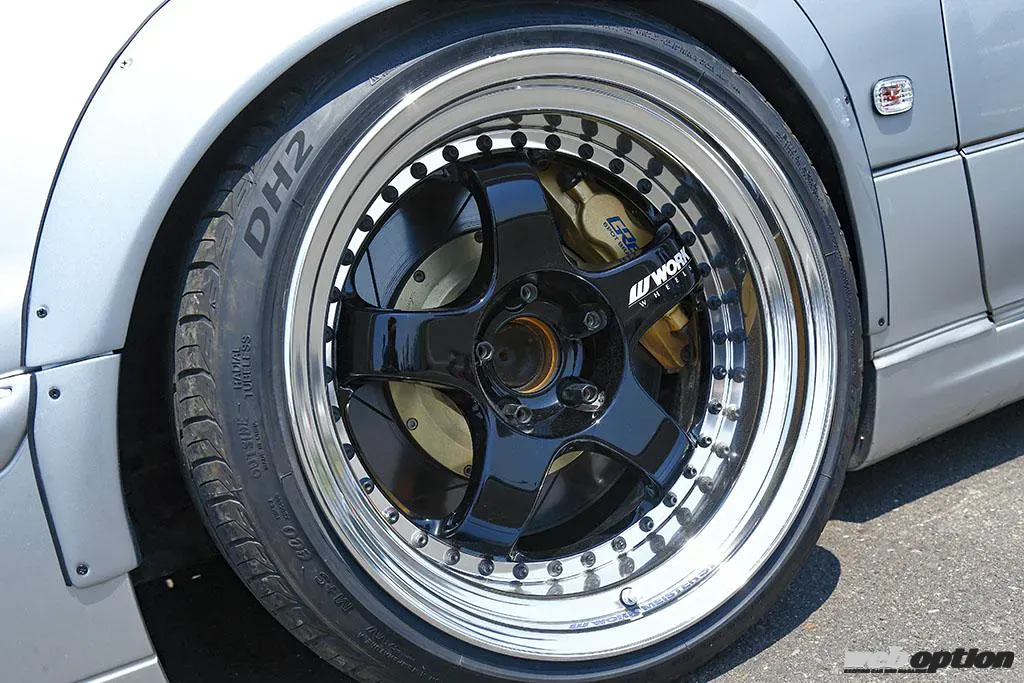 ホイールは鉄板のワークマイスターS1。フロントが9.5J、リヤが12Jというサイズだ。スポークの奥で存在感を主張するブレーキキャリパーは、トラストのGReddyアルコン。ローターは2ピースのスリット入りとなる。
