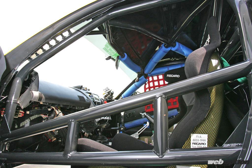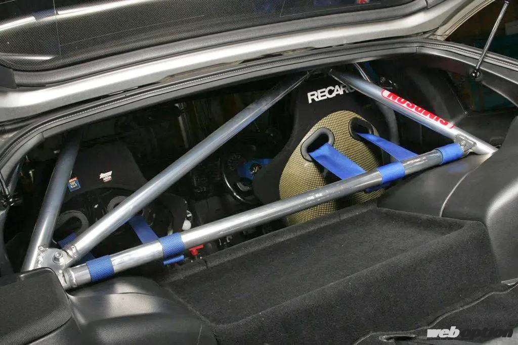 次にロールバーとロールケージの違いについてだ。まずロールバーというのは3点式〜5点式、つまりドライバーの後側、Bピラー以降の部分(大抵はストラットタワーとBピラー真下のフロア)をバー繋ぐタイプを指す。そして、ロールケージはドライバーの前側まで、Aピラー部分までバーで囲う6点式以上のタイプを指す。単純にロールケージの『ケージ』は『囲い』という意味だから、室内をバーで囲ってしまうのがロールケージというわけだ。