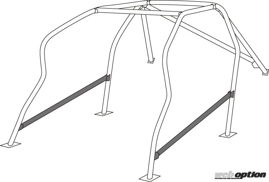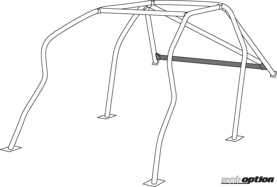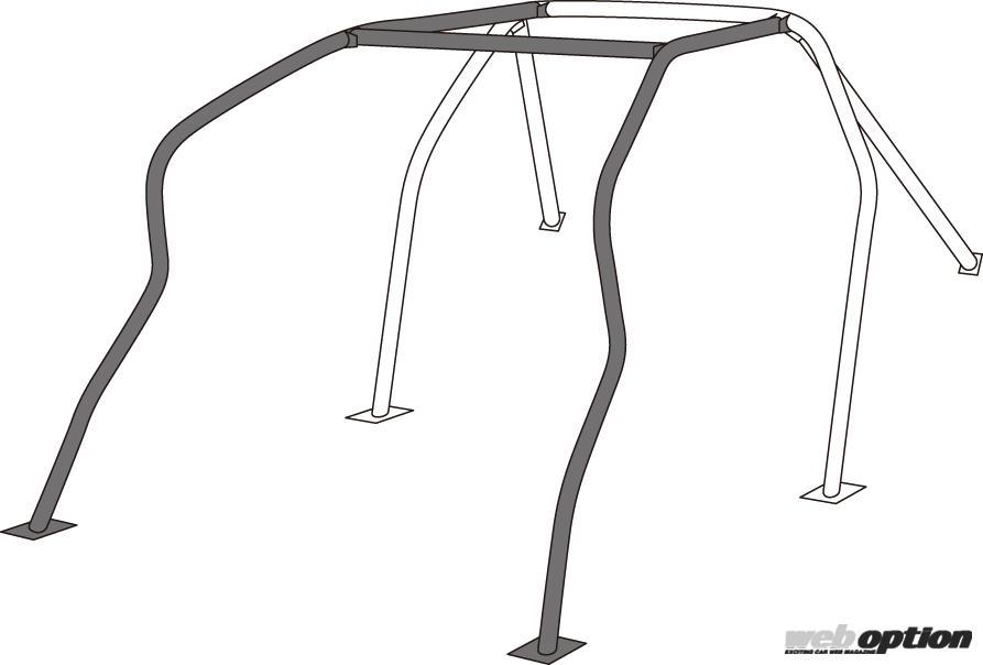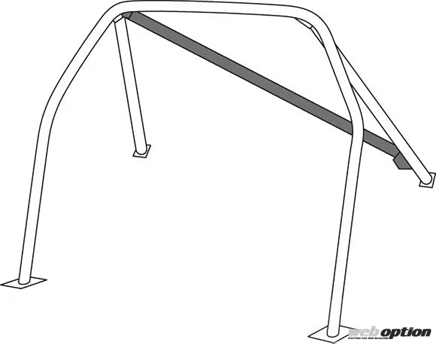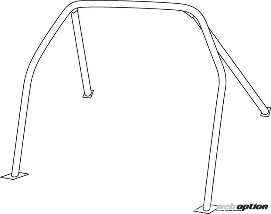 Bピラーに沿うメインバーとリヤタイヤハウスに向かうリヤバーからなるタイプ。ある意味、これがロールバーの基本型でもある。