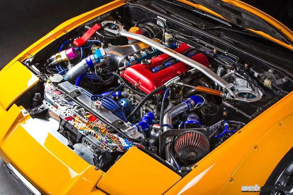 オールペンされたボディは当初、純粋なオレンジを想定していたが、山吹色に近いイエローに仕上げられたことが、結果的に個性を際立たせることとなった。なお、ブラックアウトされたインタークーラーには、NXを吹き付けて吸気温度を一気に冷却するスプレーリングを装備する。