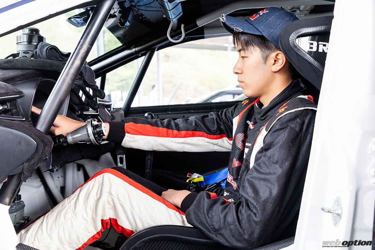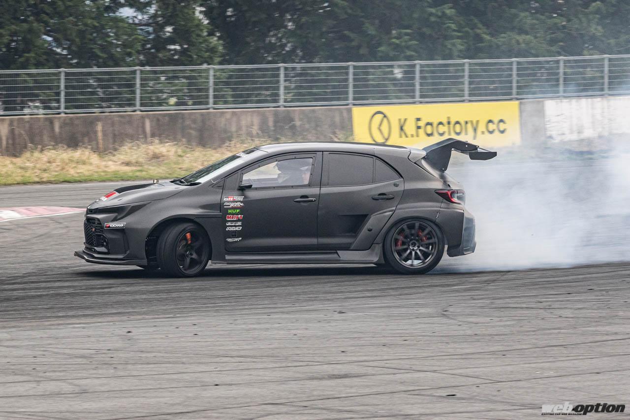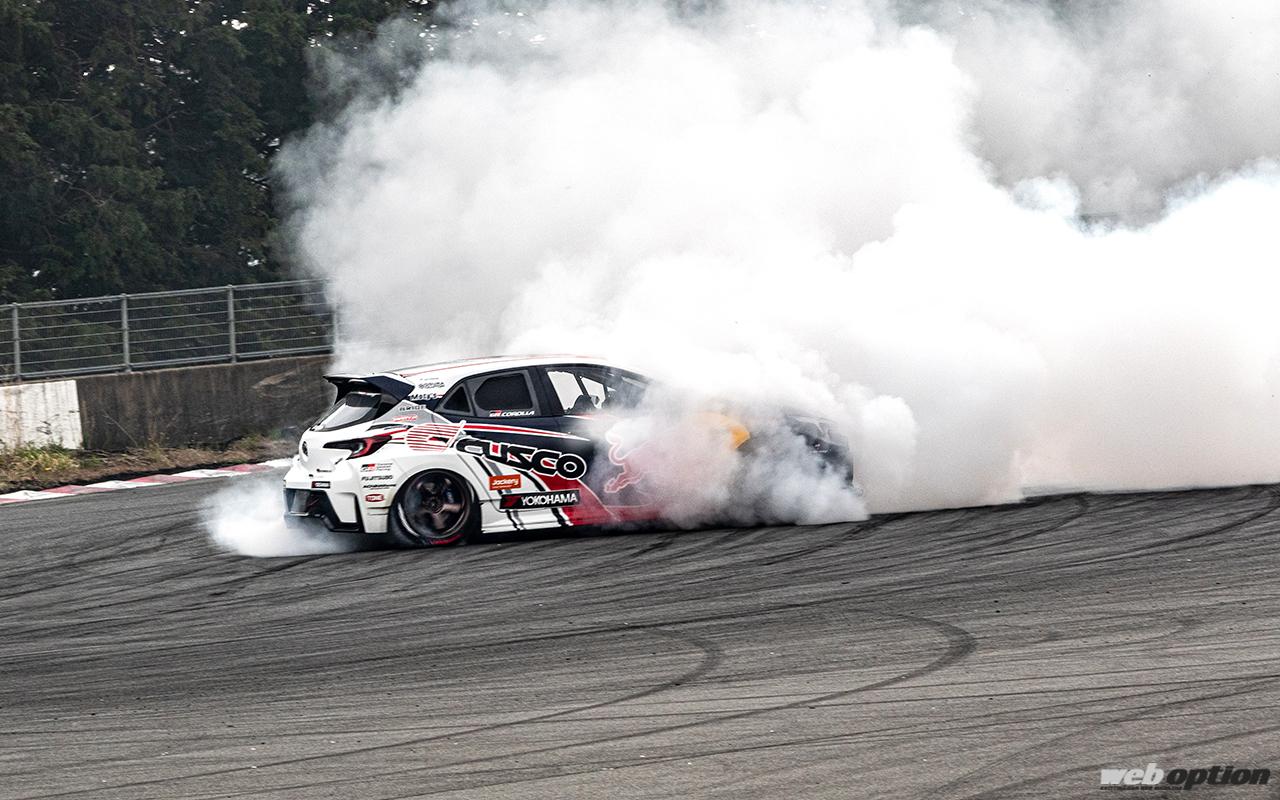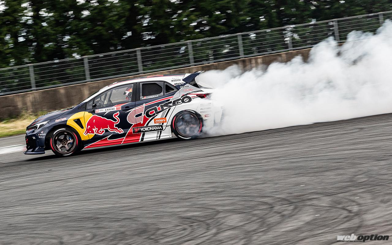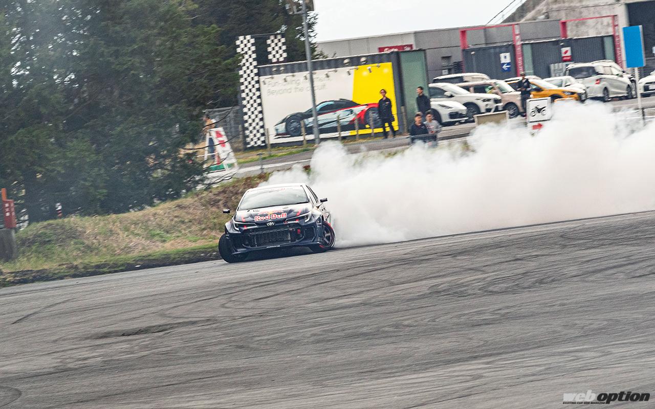 試乗ドライバーは、飯田章選手、佐藤公哉選手、坂口夏月選手、粟野如月選手、深田一希選手といった現役のレーシングドライバー&ドリフトドライバーが務めたDREAM RIDE。その中で、群を抜いて『若さ』を発揮していたのがRed Bull GR COROLLAを駆る箕輪大也選手だ。