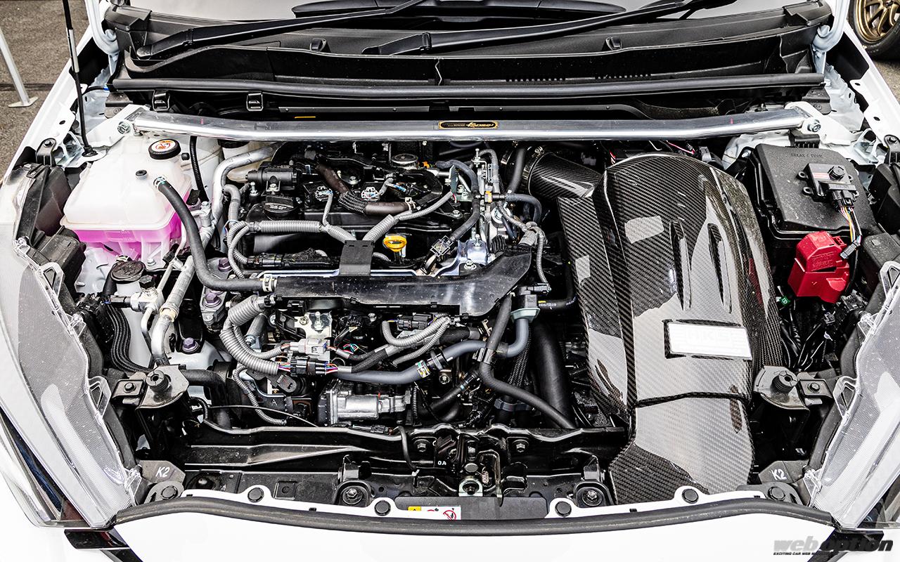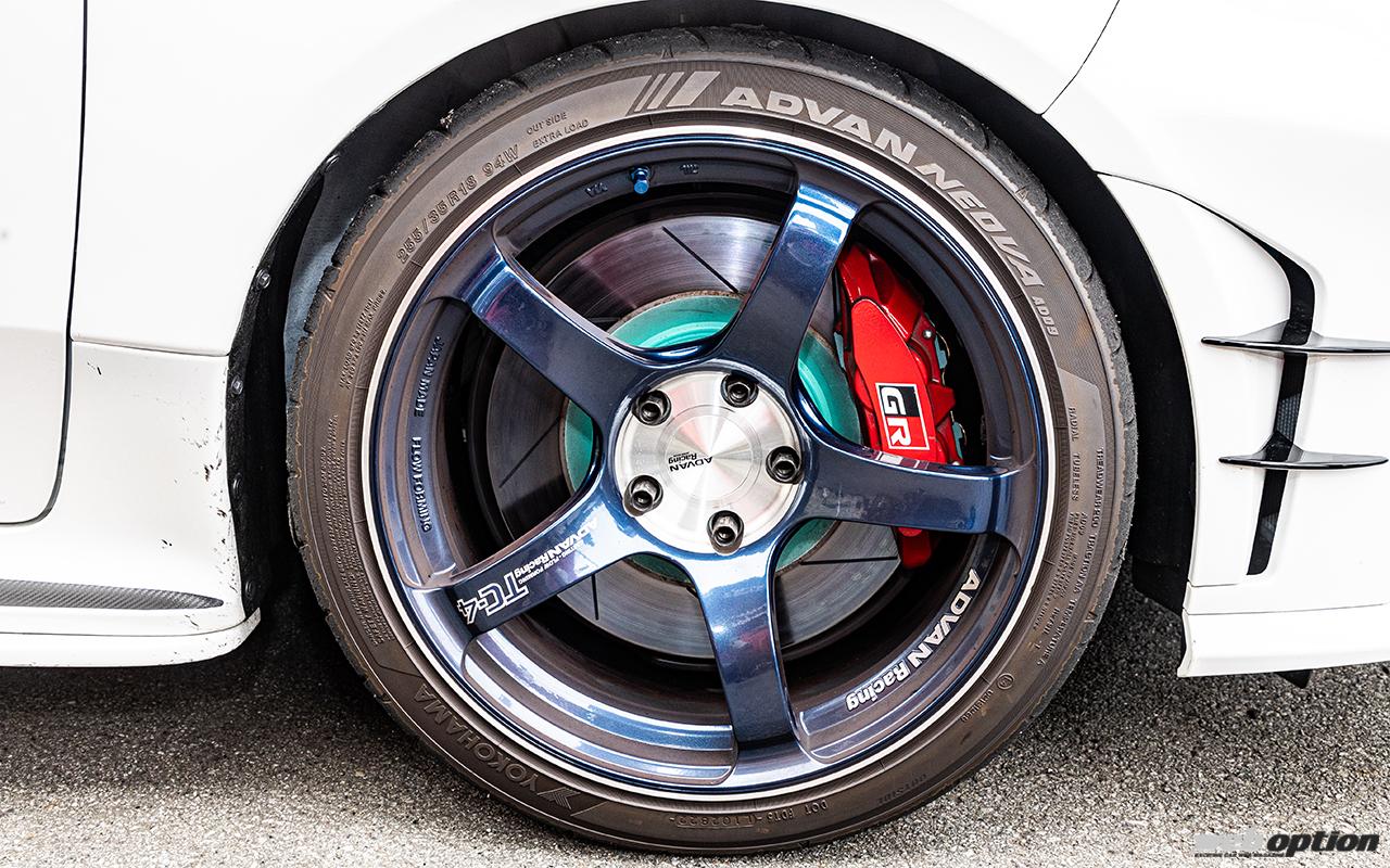 ホイール&タイヤは、アドバンレーシングTC-4 SE(9.5J×18+45)にアドバンネオバAD09(255/35-18)の組み合わせ。「公道仕様なので、タイヤは安定感のあるアドバンネオバAD09にしていますけど、GRヤリスとの相性が良くてメチャクチャ楽しいですよ!」とは向井代表。